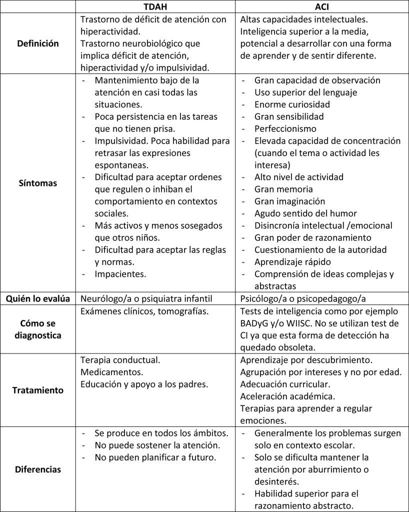 Uno de los diagnósticos erróneos más comunes es el de TDAH a un niño que en realidad tiene Altas Capacidades Intelectuales. Si bien, estas dos condiciones pueden presentarse juntas en lo que se llama un niño «Doblemente Excepcional», lo más habitual es que el niño solo presente características de ACI que son confundidas con las de TDAH.